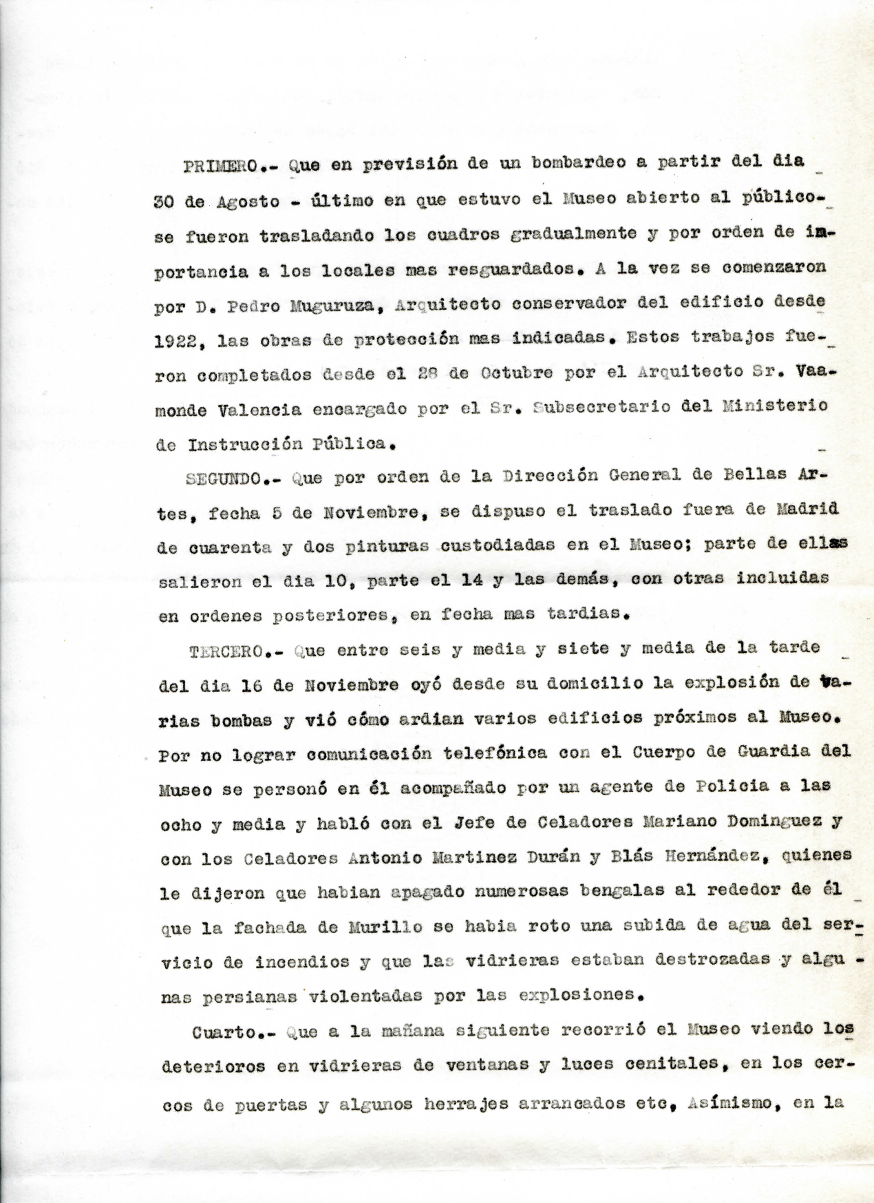 Informe sobre el bombardeo al Museo del Prado y las medidas adoptadas para la salvaguarda de obras de arte. Fecha aprox. 31-12-1936. Página 1.